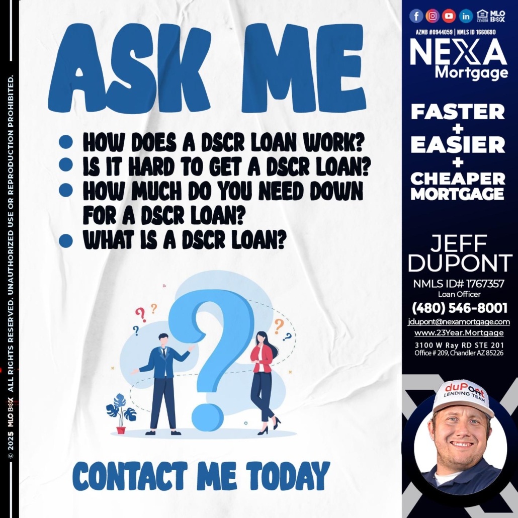 Hi, my name is Jeff duPont. I’m a Loan Officer with NEXA Mortgage LLC., offering personalized mortgage solutions, fast customized quotes, great rates and service with integrity.
