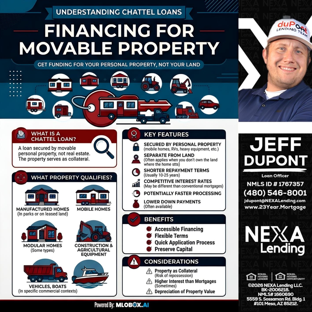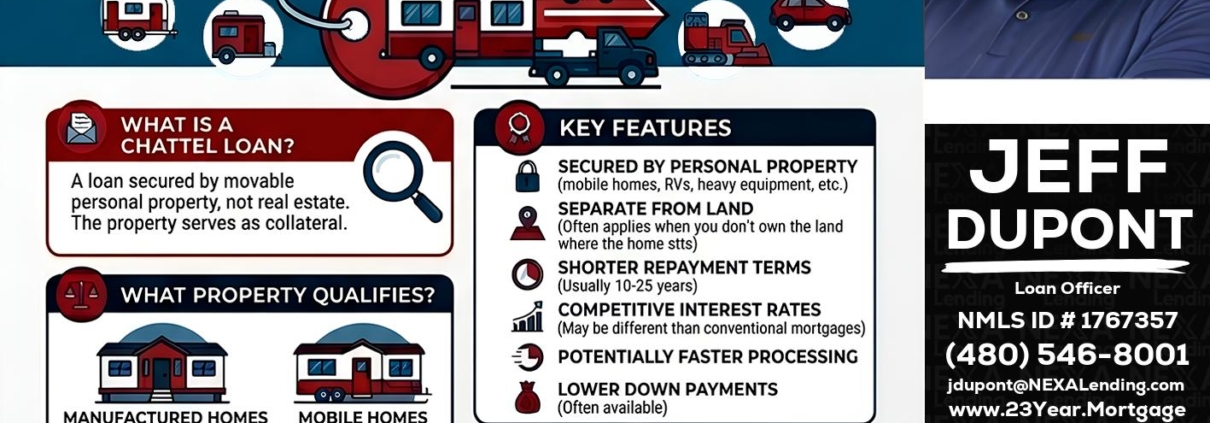 Hi, my name is Jeff duPont. I’m a Loan Officer offering personalized mortgage solutions, fast customized quotes, great rates and service with integrity. If you’re interested in learning more about the Chattel loan or any other, just let me know and I’ll walk you through your options.