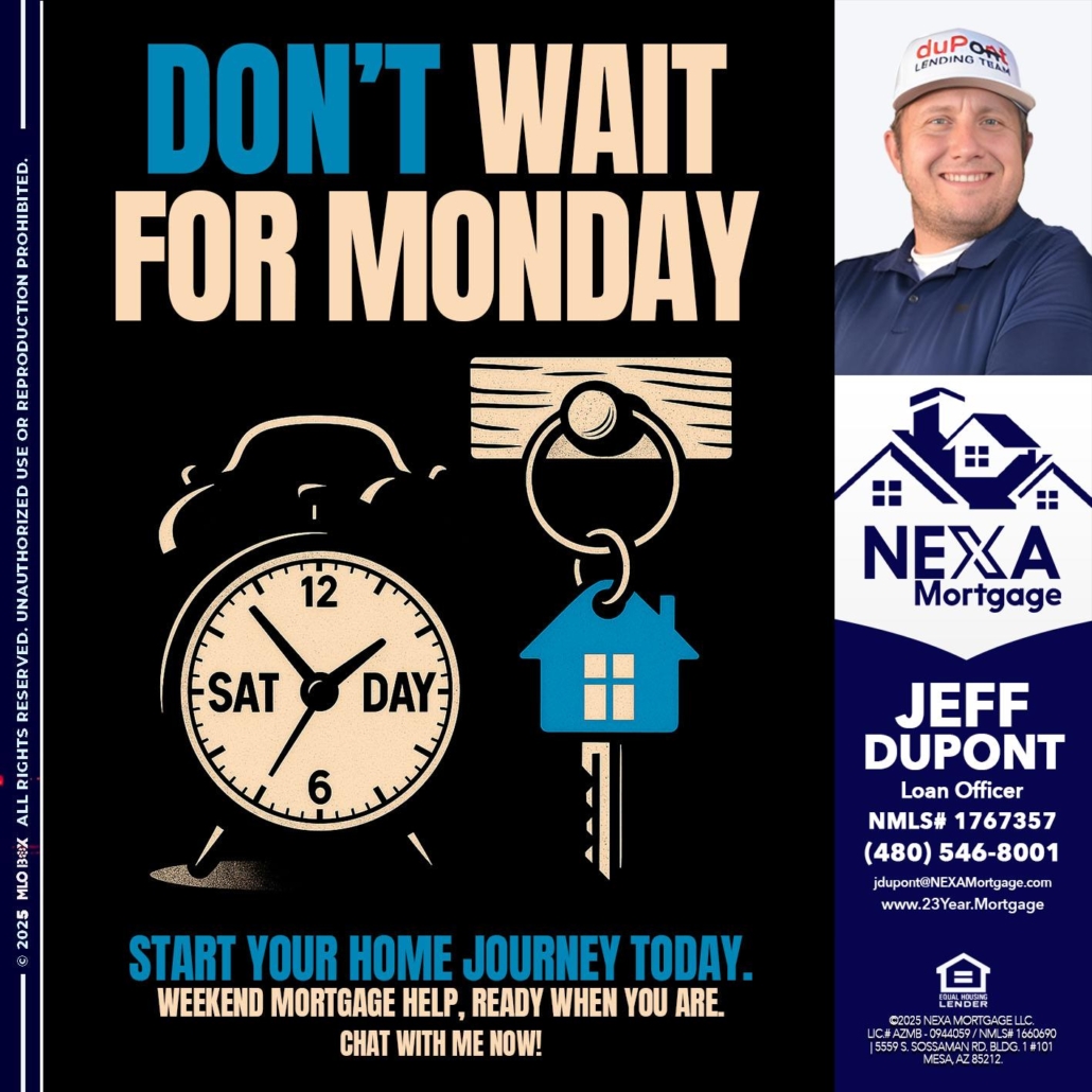 Hi, my name is Jeff duPont. I’m a Loan Officer with NEXA Mortgage LLC., offering personalized mortgage solutions, fast customized quotes, great rates and service with integrity.