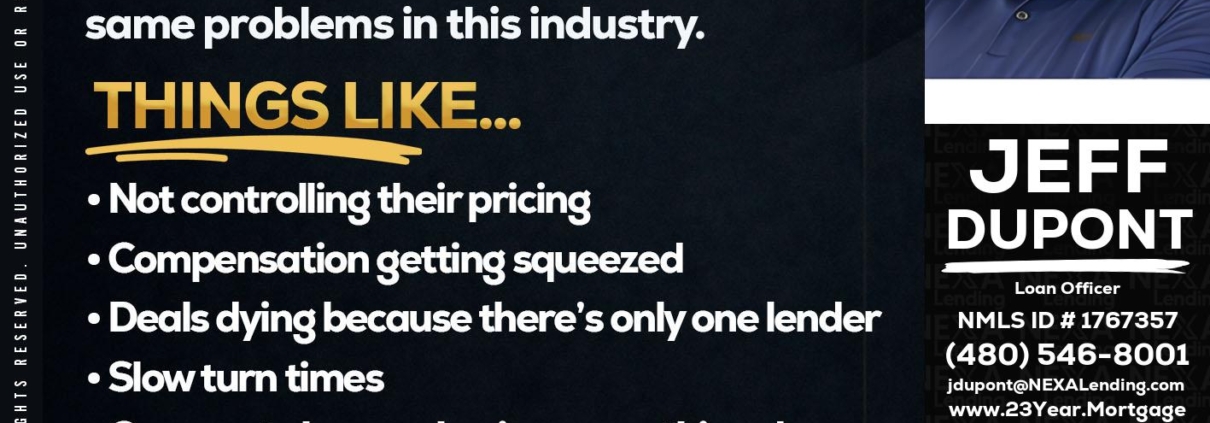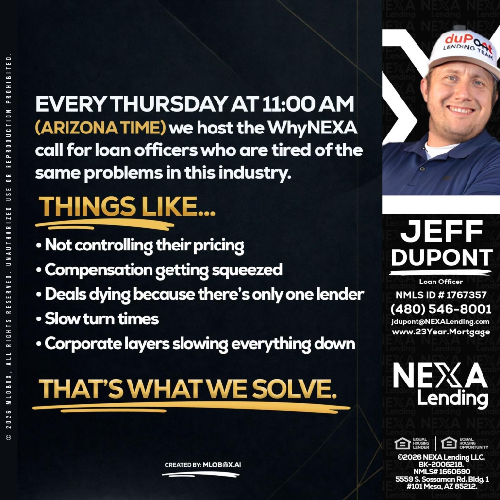 Hi, my name is Jeff duPont. I’m a Loan Officer with NEXA Lending LLC., offering personalized mortgage solutions, fast customized quotes, great rates and service with integrity.