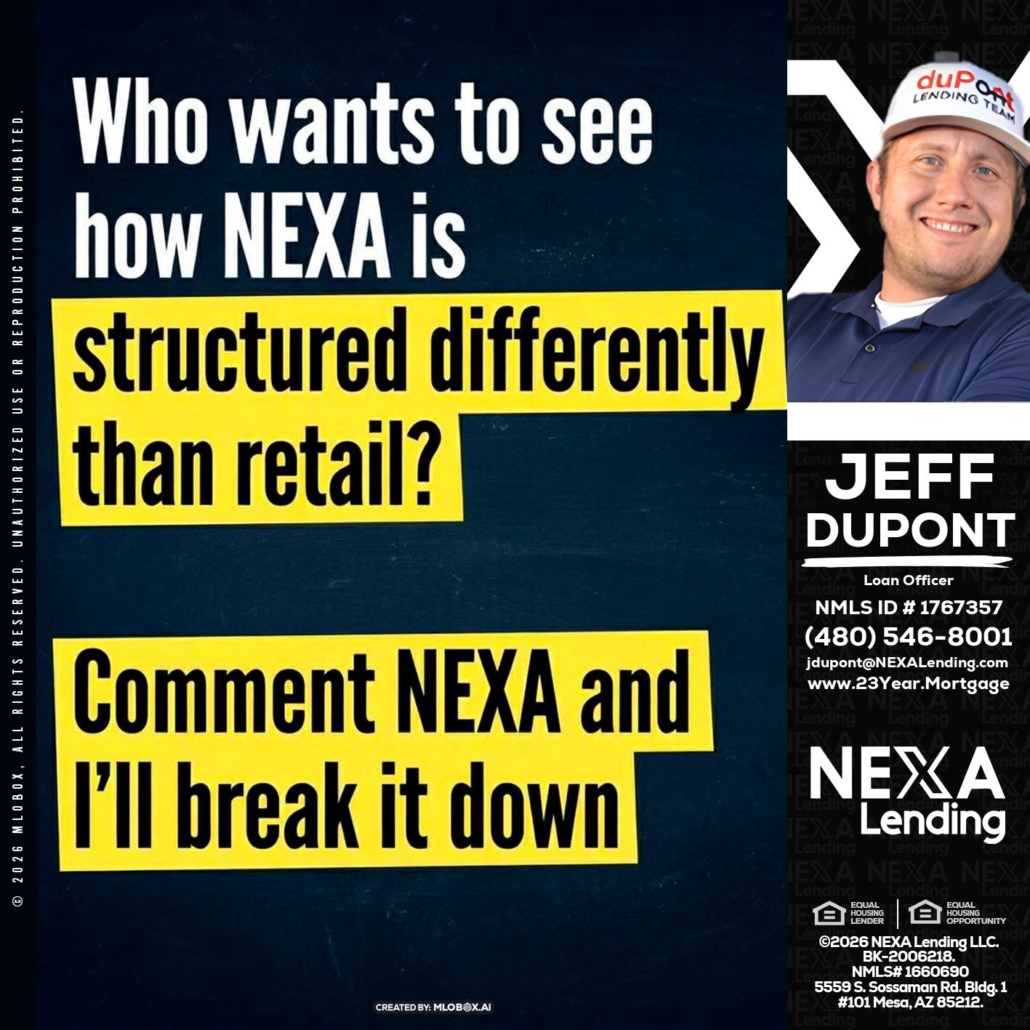 Hi, my name is Jeff duPont. I’m a Loan Officer with NEXA Lending LLC., offering personalized mortgage solutions, fast customized quotes, great rates and service with integrity.